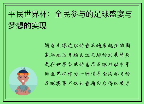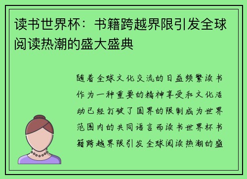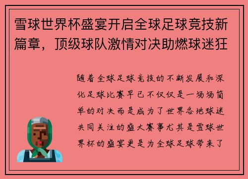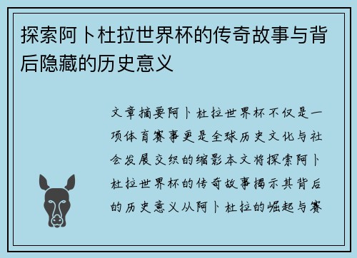 《真爱世界杯:跨越时空的激情碰撞与不朽传奇的永恒传承》是一篇探讨世界杯作为全球最盛大体育赛事之一的深远意义与影响的文章。文章将从四个方面展开分析:第一,世界杯对世界文化的影响;第二,世界杯比赛中的经典瞬间与历史遗产;第三,世界杯背后的经济效应与全球化趋势;第四,世界杯与球迷情感的深刻联结。这些方面通过具体案例和学术研究进行详细阐述,力求展现世界杯如何通过激情碰撞与历史积淀,跨越时空,成为一项永恒的...
