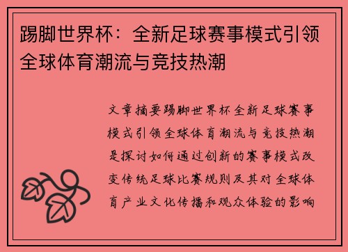 本文将详细阐述即将开赛的龟王世界杯揭幕战赛制全新升级所带来的赛事新篇章。随着全球体育赛事的快速发展,足球赛事的竞争力日益增强,特别是龟王世界杯此次赛制改革的重要性,受到广泛关注。通过创新的赛制设计,龟王世界杯不仅给参赛队伍带来了更多的机会和挑战,同时也为全球观众提供了全新的观看体验。文章将从以下四个方面进行分析:第一,赛制的升级与创新;第二,参赛队伍的动态调整;第三,科技与数据分析在新赛制中的应用...